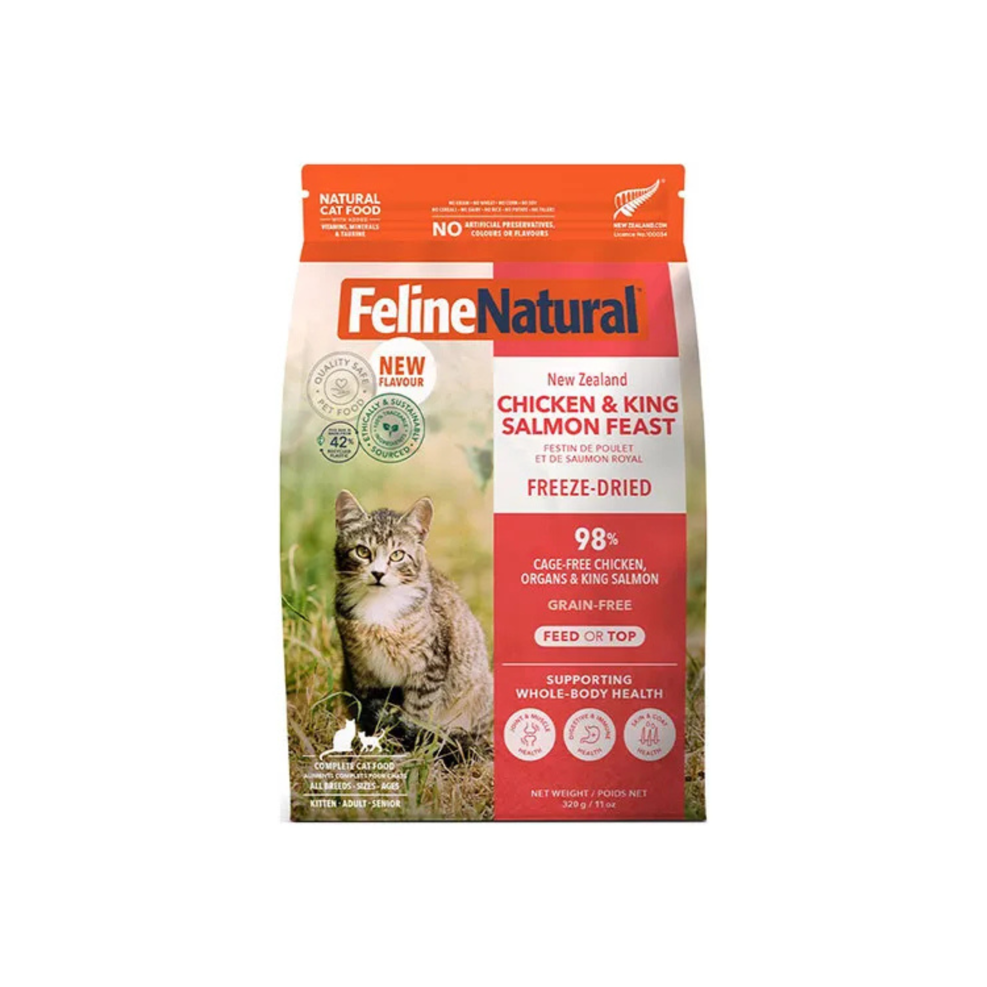 鶏肉、肝臓(鶏)、鮭、ニュージーランド緑イ貝、ビタミンE、ホキ(白身魚)オイル、乾燥昆布、タウリン、フラックスシードフレーク、塩化コリン、リン酸二カリウム、塩化ナトリウム、ミネラル類(酸化マグネシウム、プロティネイト亜鉛、プロティネイト銅、プロティネイトマンガン)、ビタミン類(ビタミンB1、ビタミンB6、葉酸、ビタミンD3)